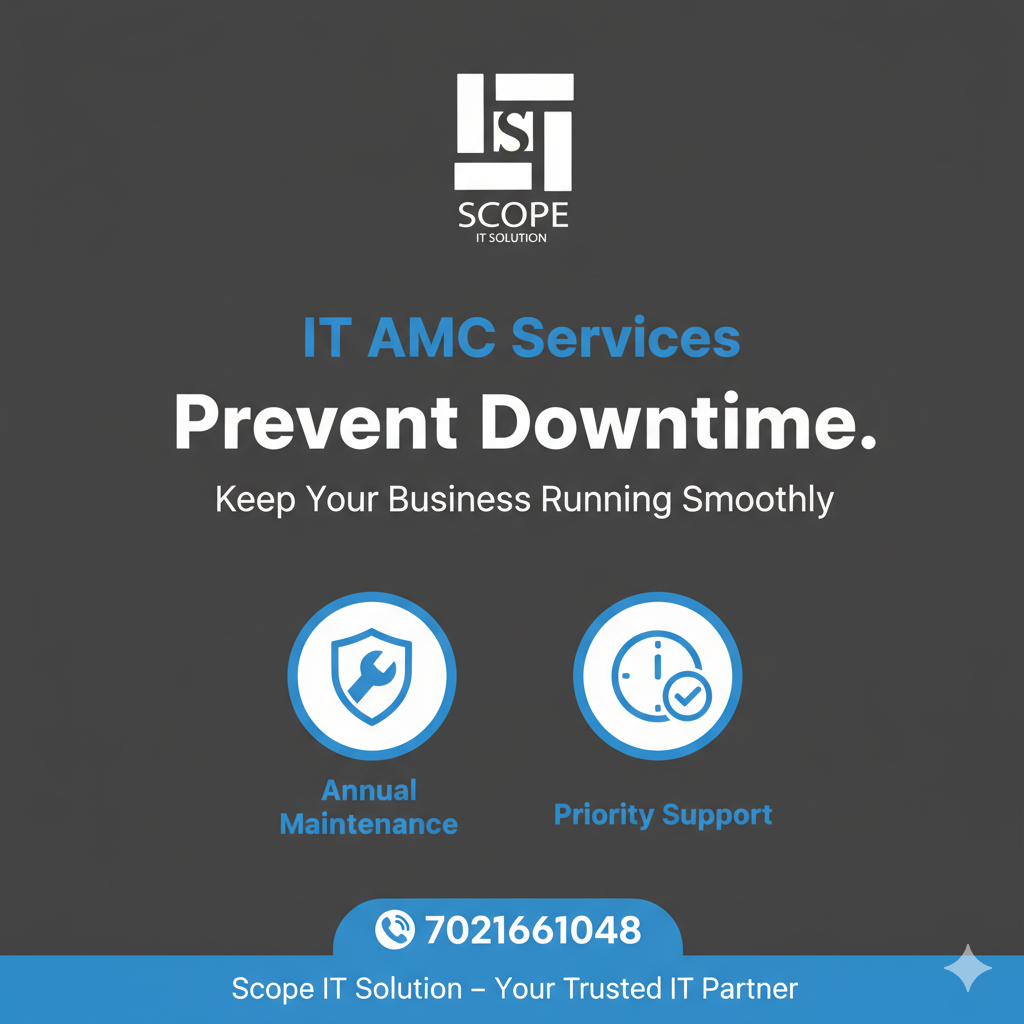 Running a business means staying online and productive 24/7 — and IT downtime can cost more than just time. That’s why Scope IT Solution offers Smart Maintenance Contracts (AMC) designed to keep your systems running smoothly and securely.